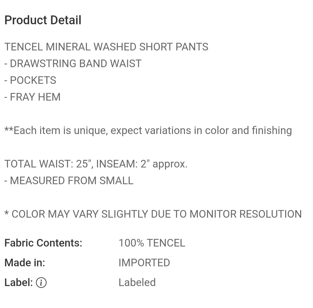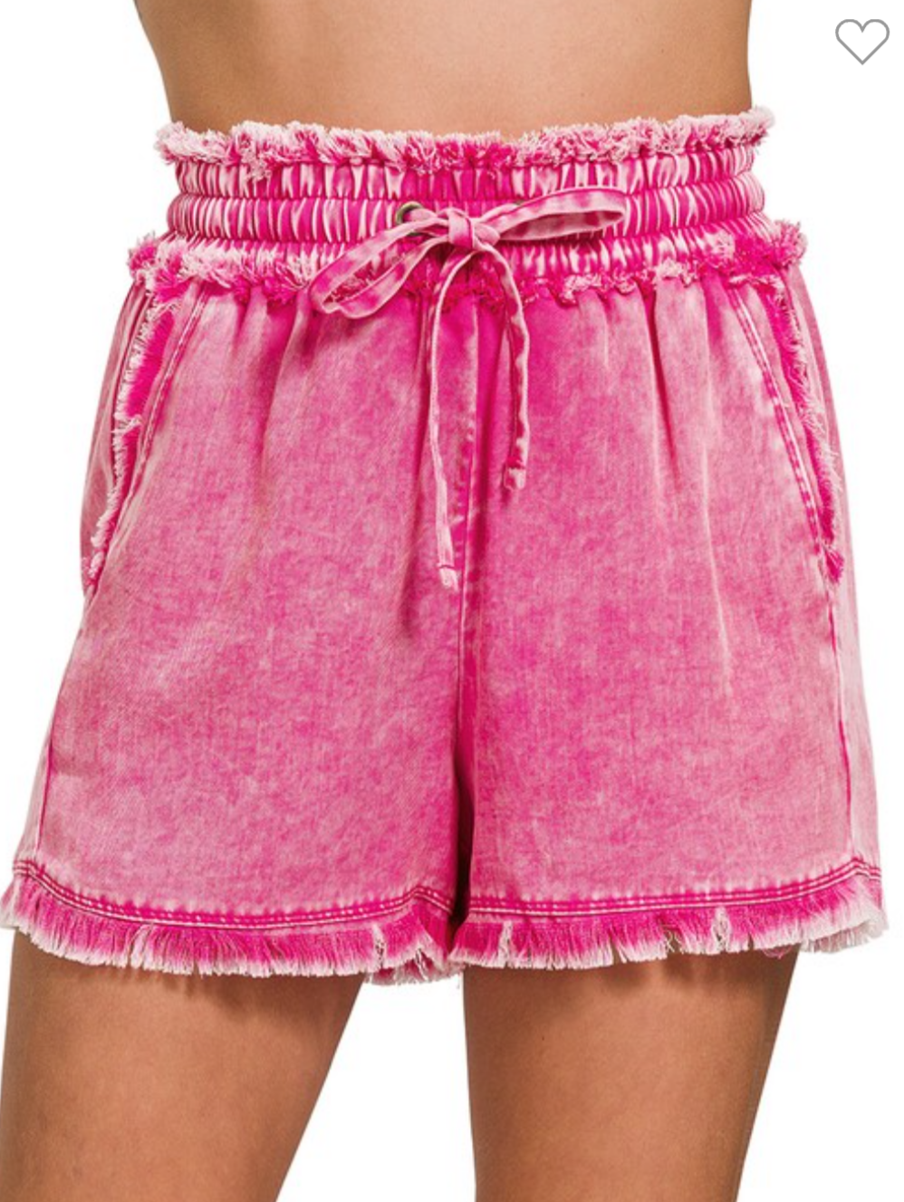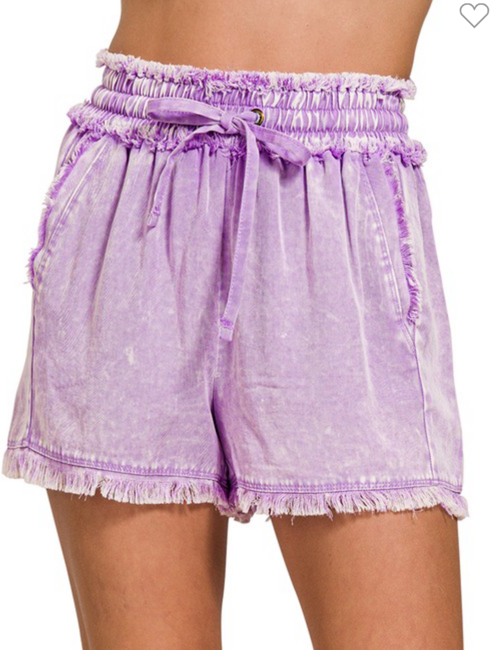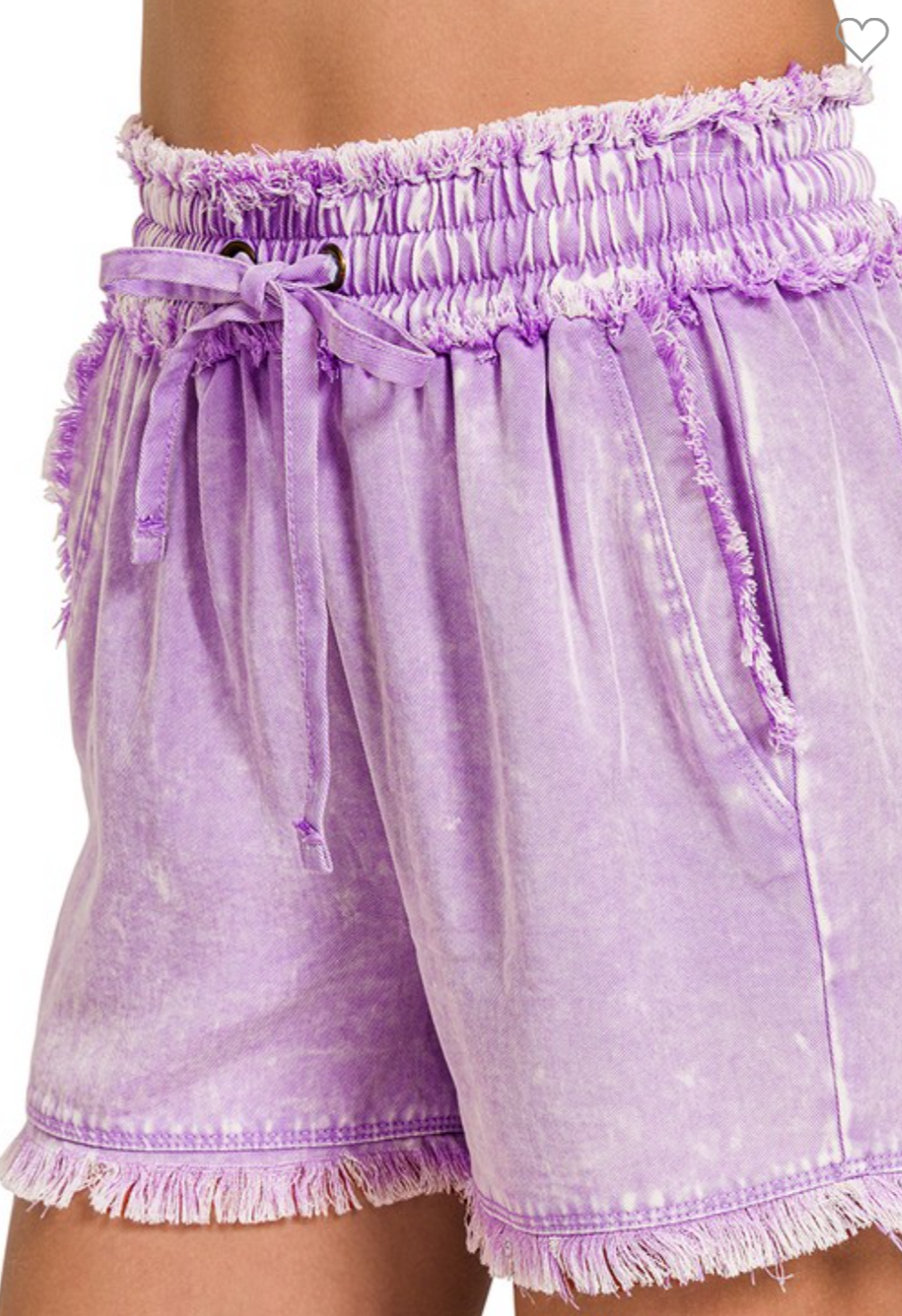 Mineral wash shorts, drawstring waist band, side pockets, and a frayed hem. These are Zenana brand, and available in 3 colors.