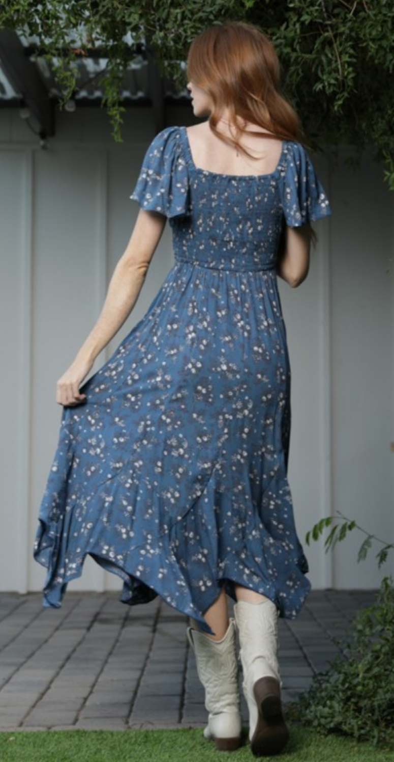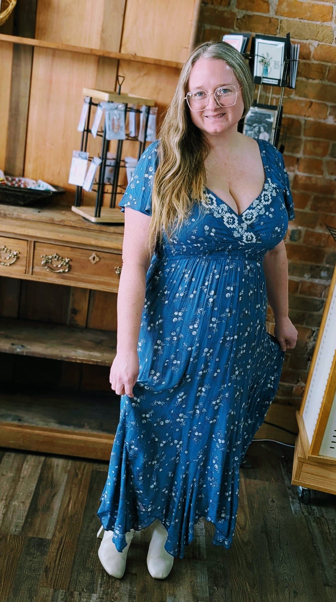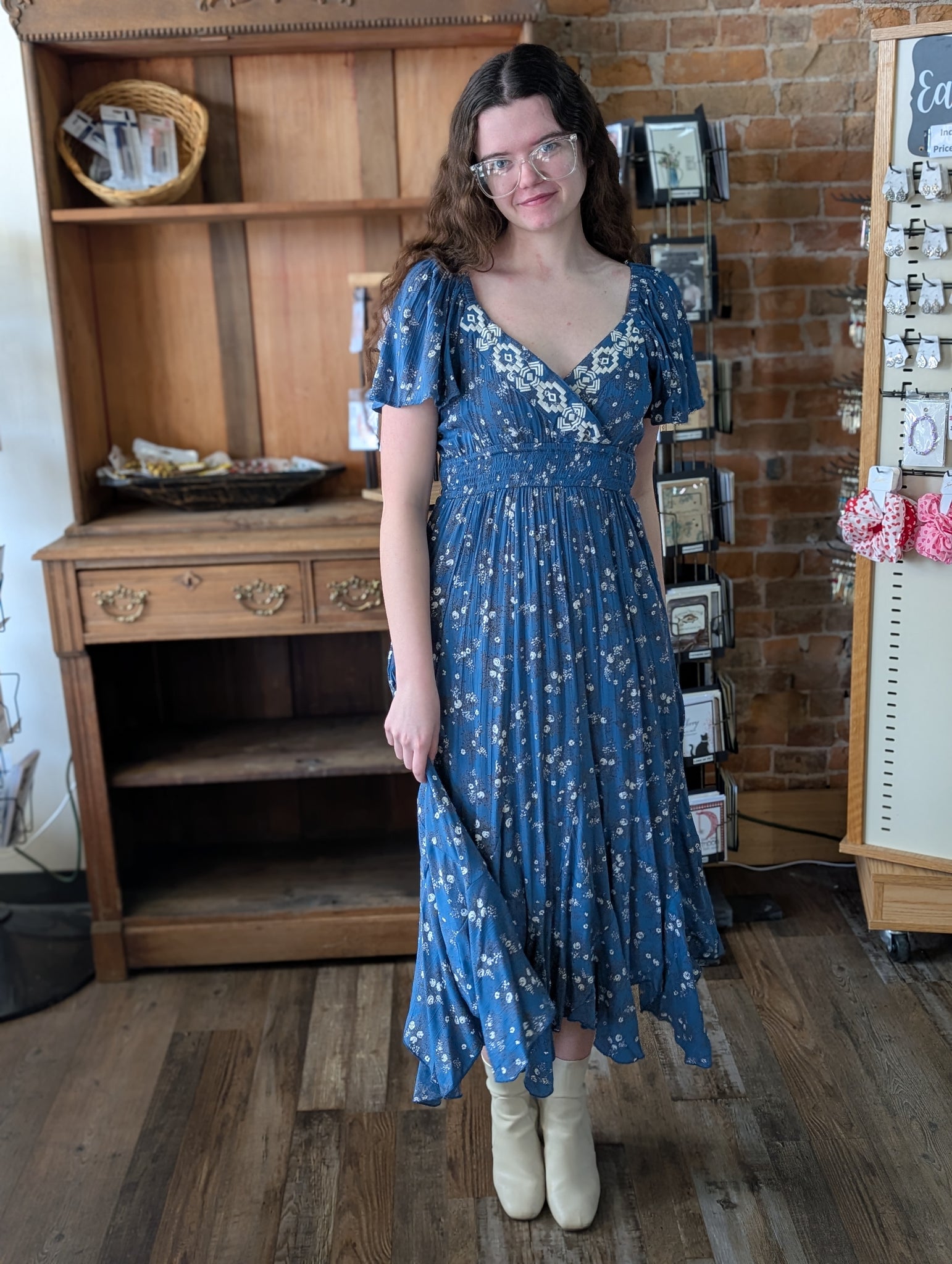 Becky Blue Dress is a fun floral print dress. She has embroidered detail around the neckline. She has a twirly skirt that's midi length.
