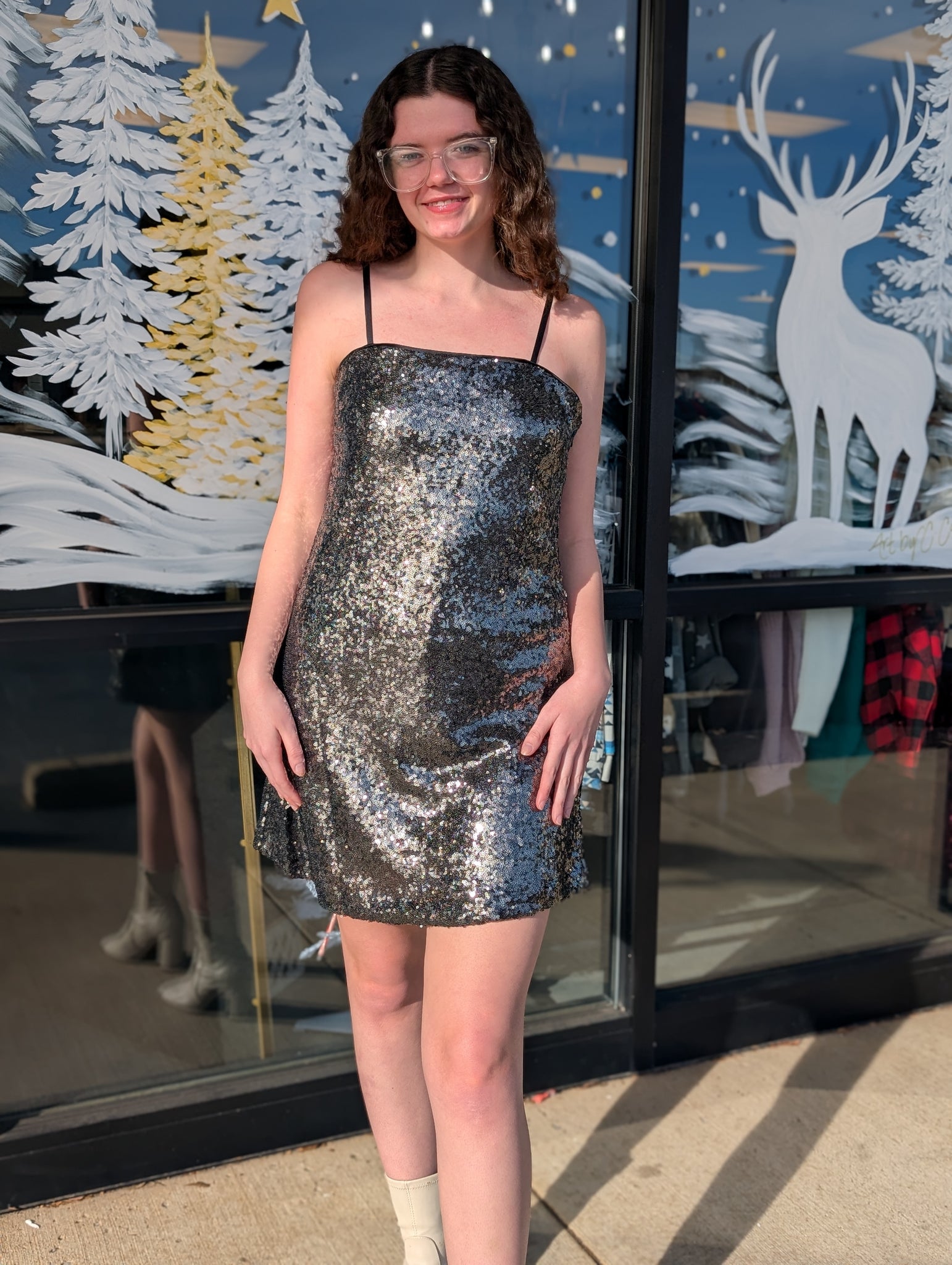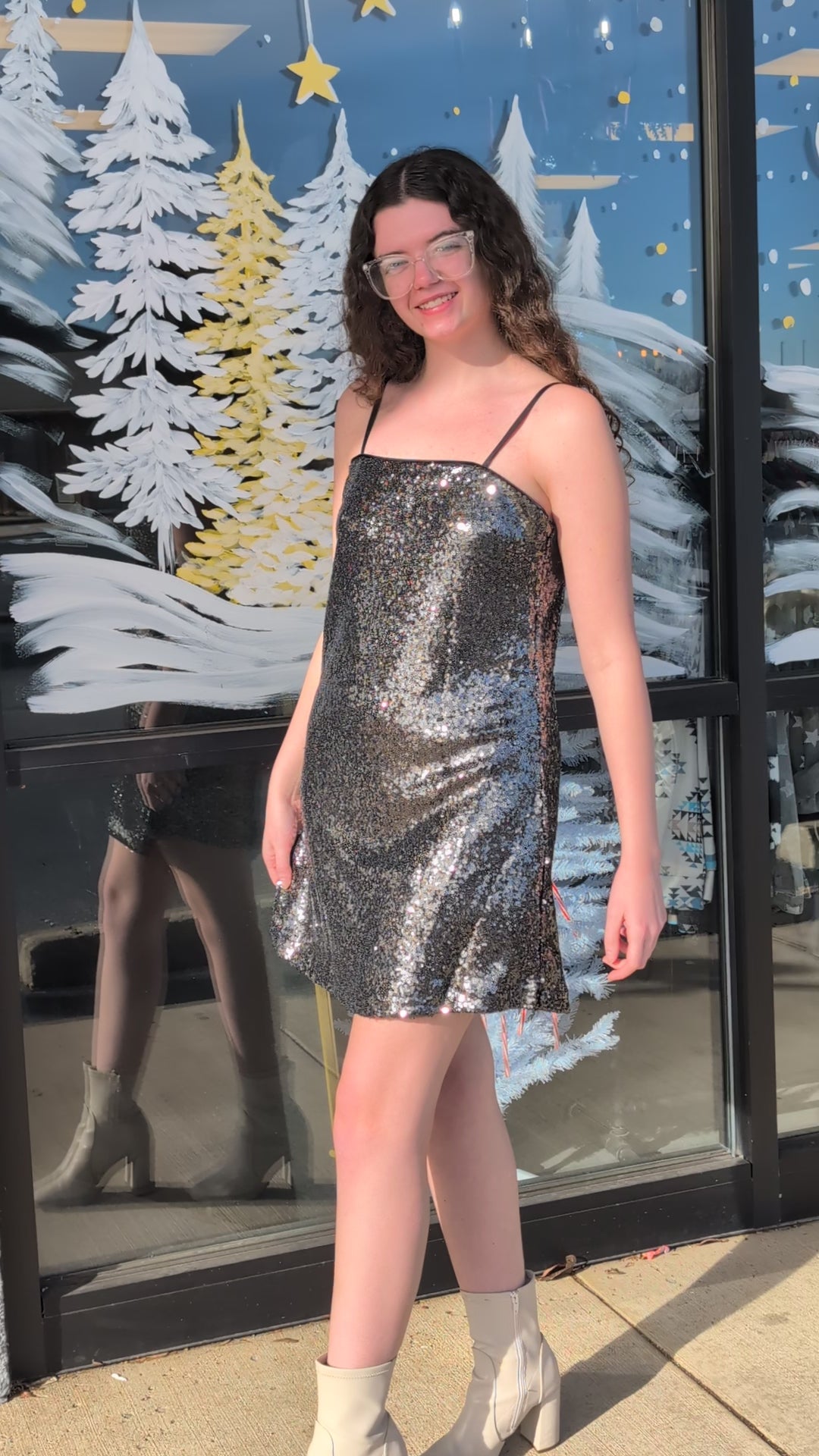 Black Sequin Dress is mini length with adjustable straps. She's generously sized. Perfect for any holiday party 🎉Â