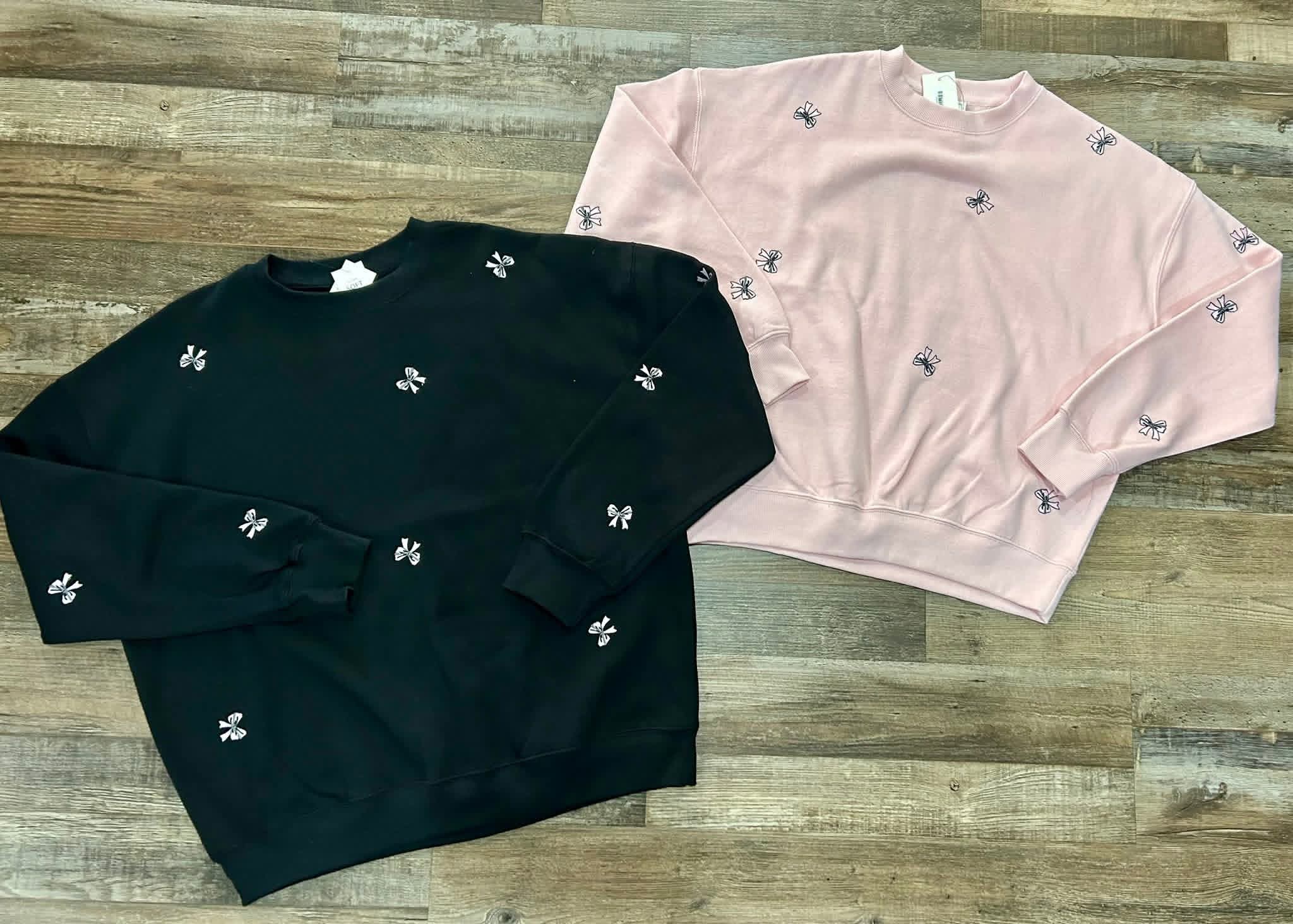 Get cozy and stylish with our Bow Embroidered Sweatshirt. Featuring embroidered bows, this sweatshirt is both cute and comfortable. Choose from two color options, pink and black, to match your personal style. Perfect for a relaxed day out (or in!).