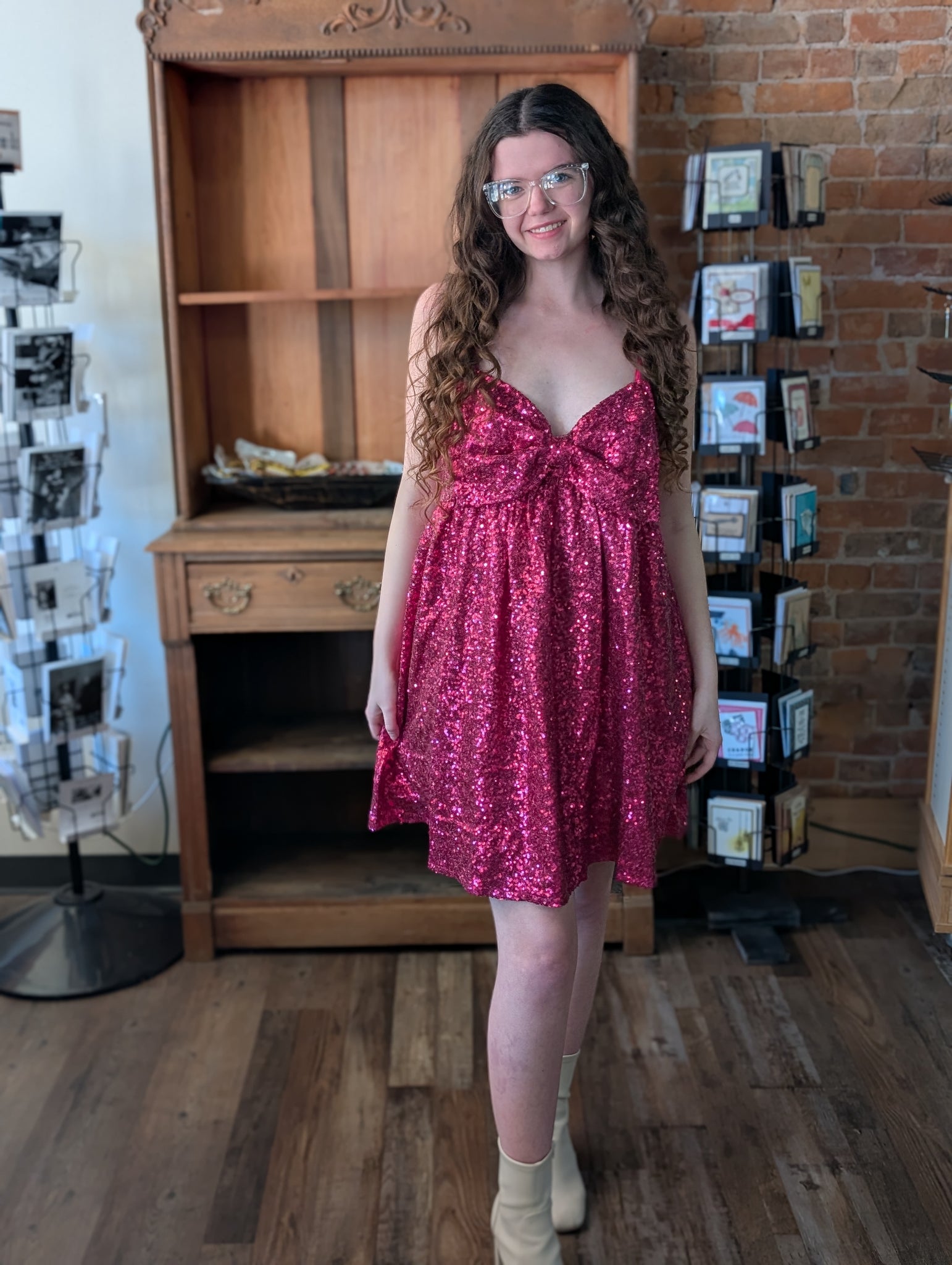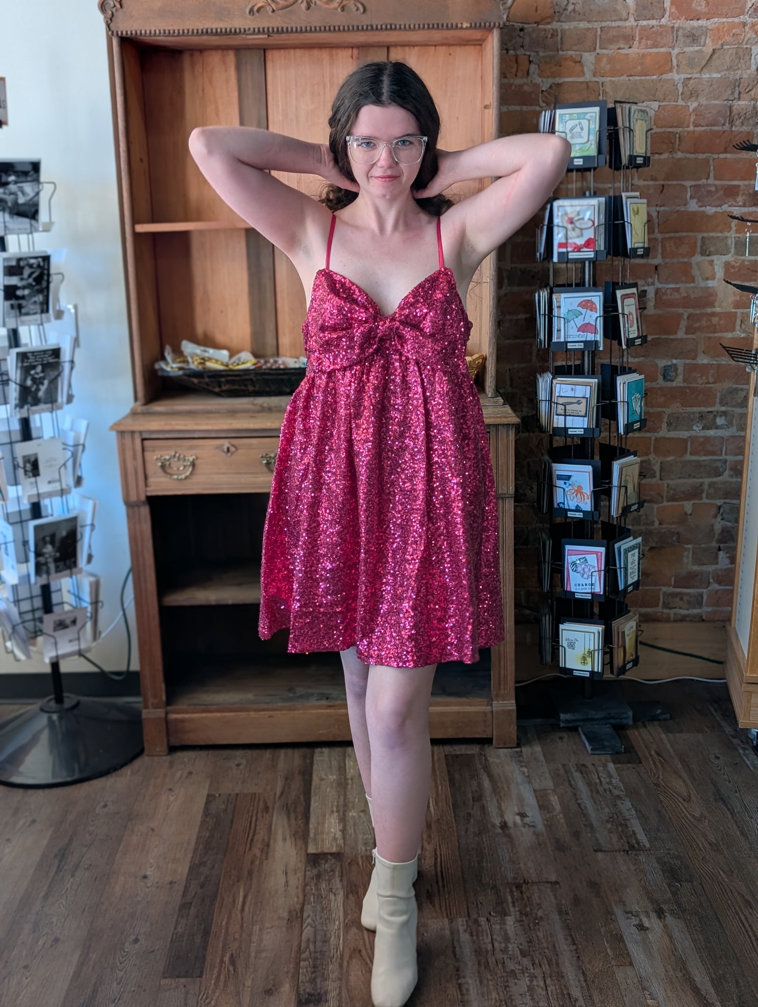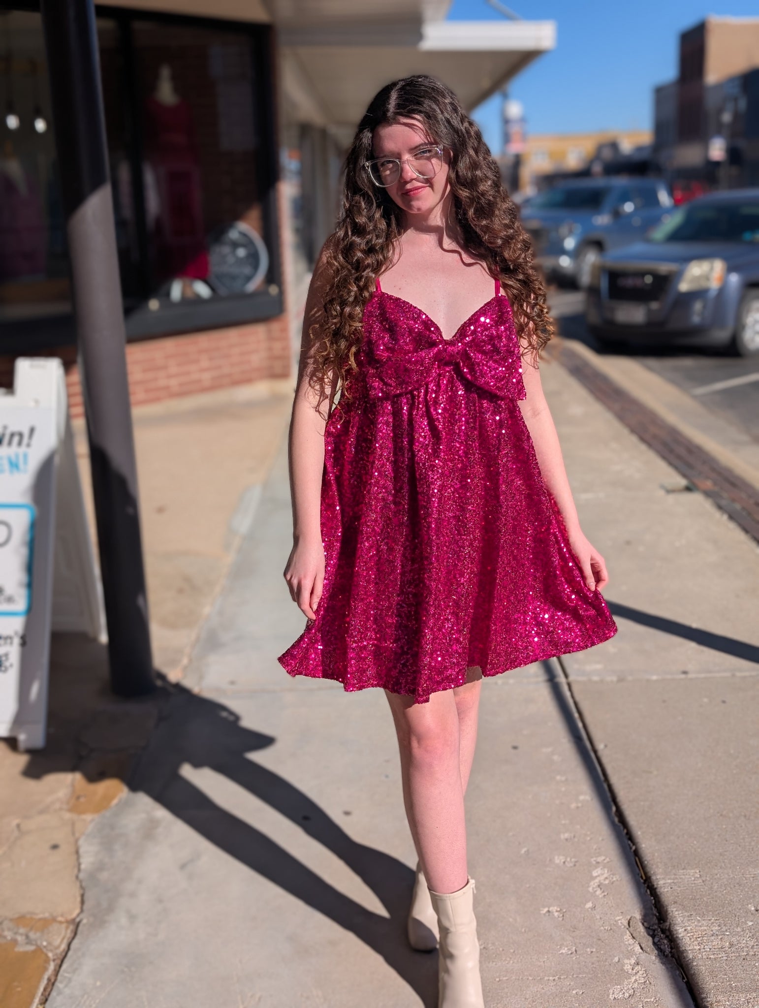 This sequin dress with front bow detail is sure to turn some heads! She has adjustable spaghetti straps.