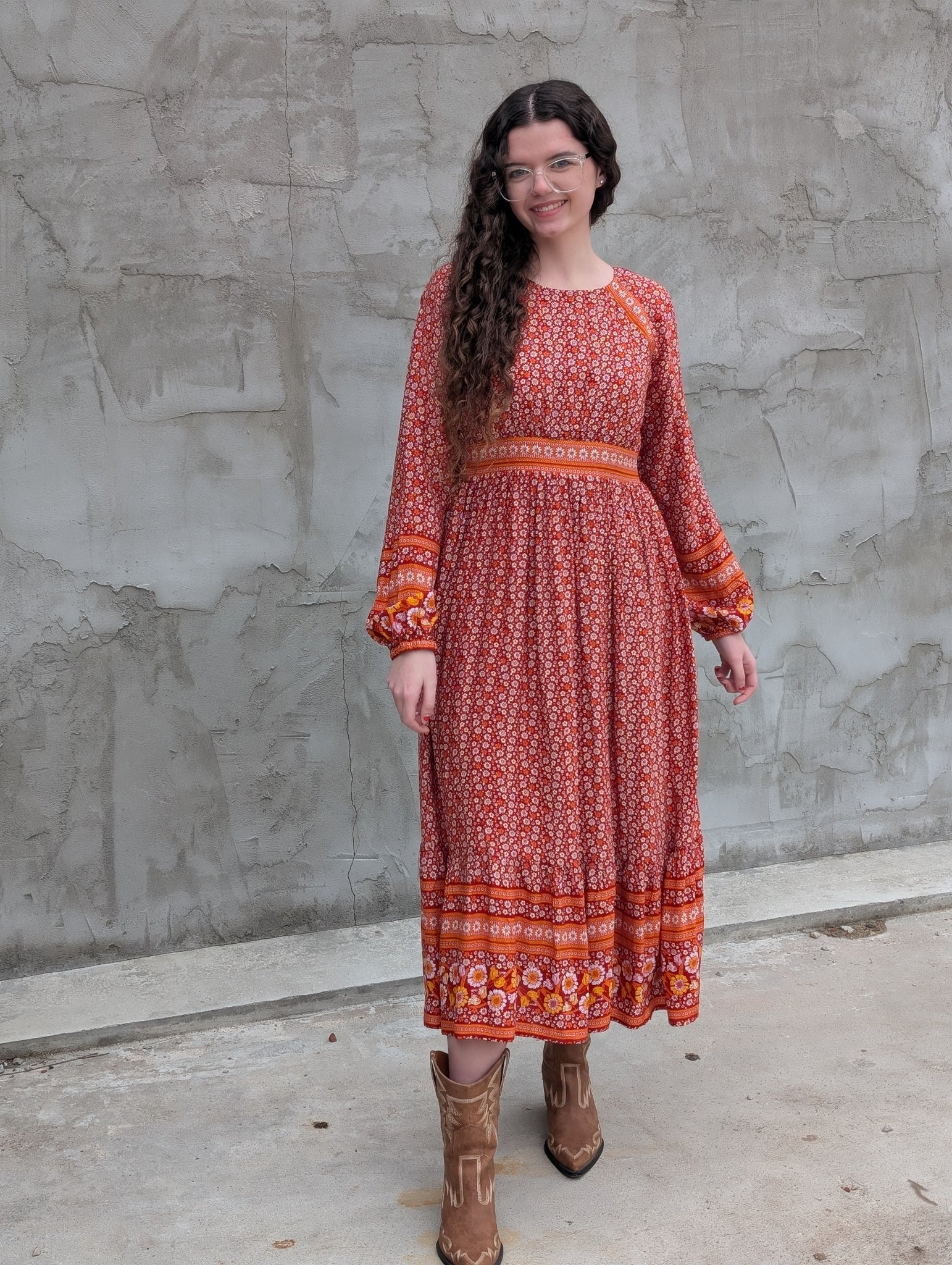 Hayley Dress is a gorgeous floral dress that is fully lined. She has long sleeves and a bold border. Another great option for those fall family photos 🥰