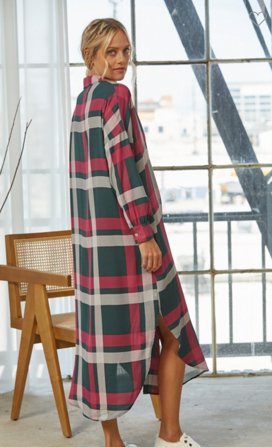 Holiday Journey Dress is a maxi length button down dress. Her fabric is breathable, and she has pockets 🎉 Throw a denim jacket on for a layered look, open her up to wear her like a duster, or it's beautiful as a dress. ❤️