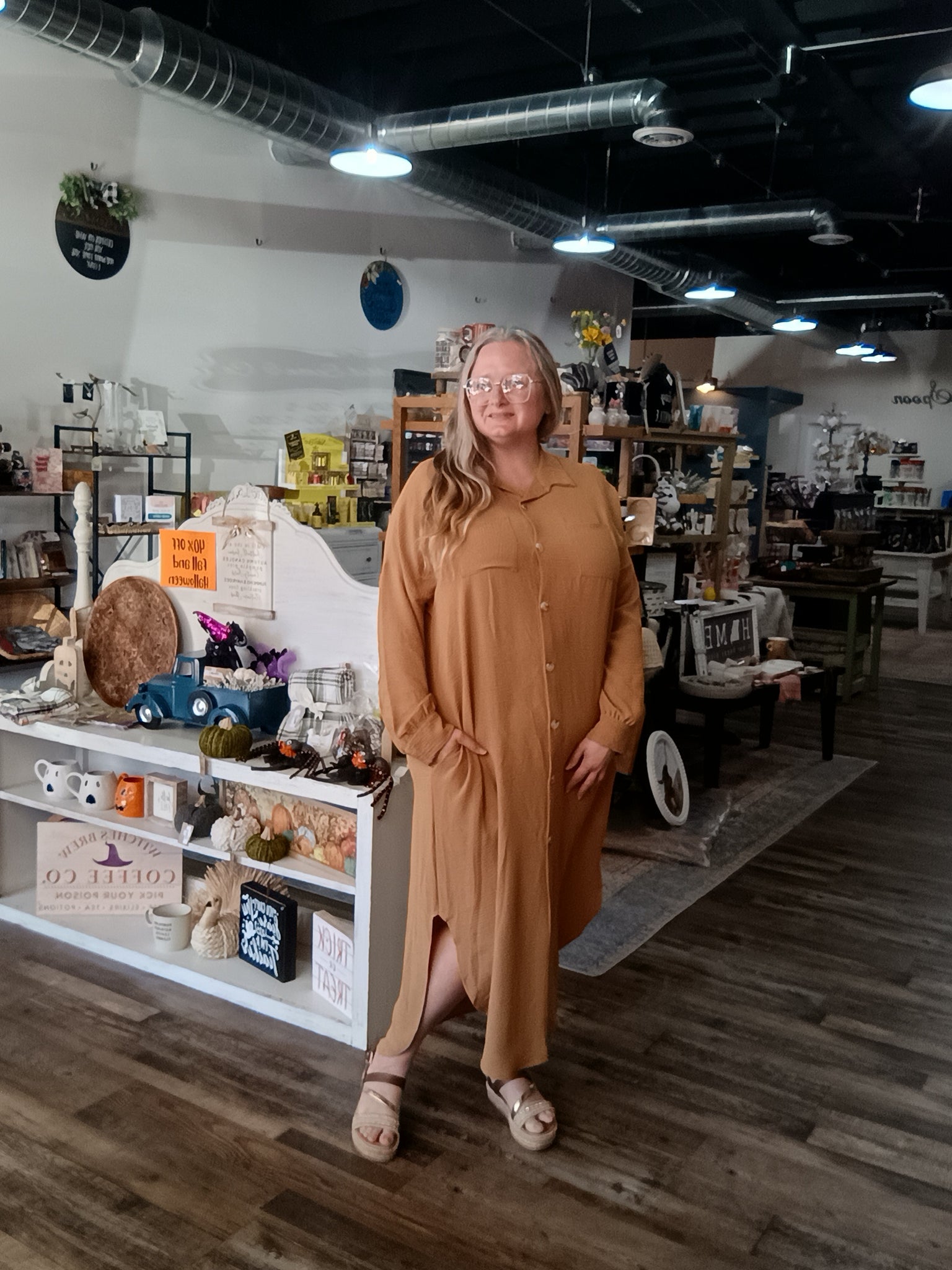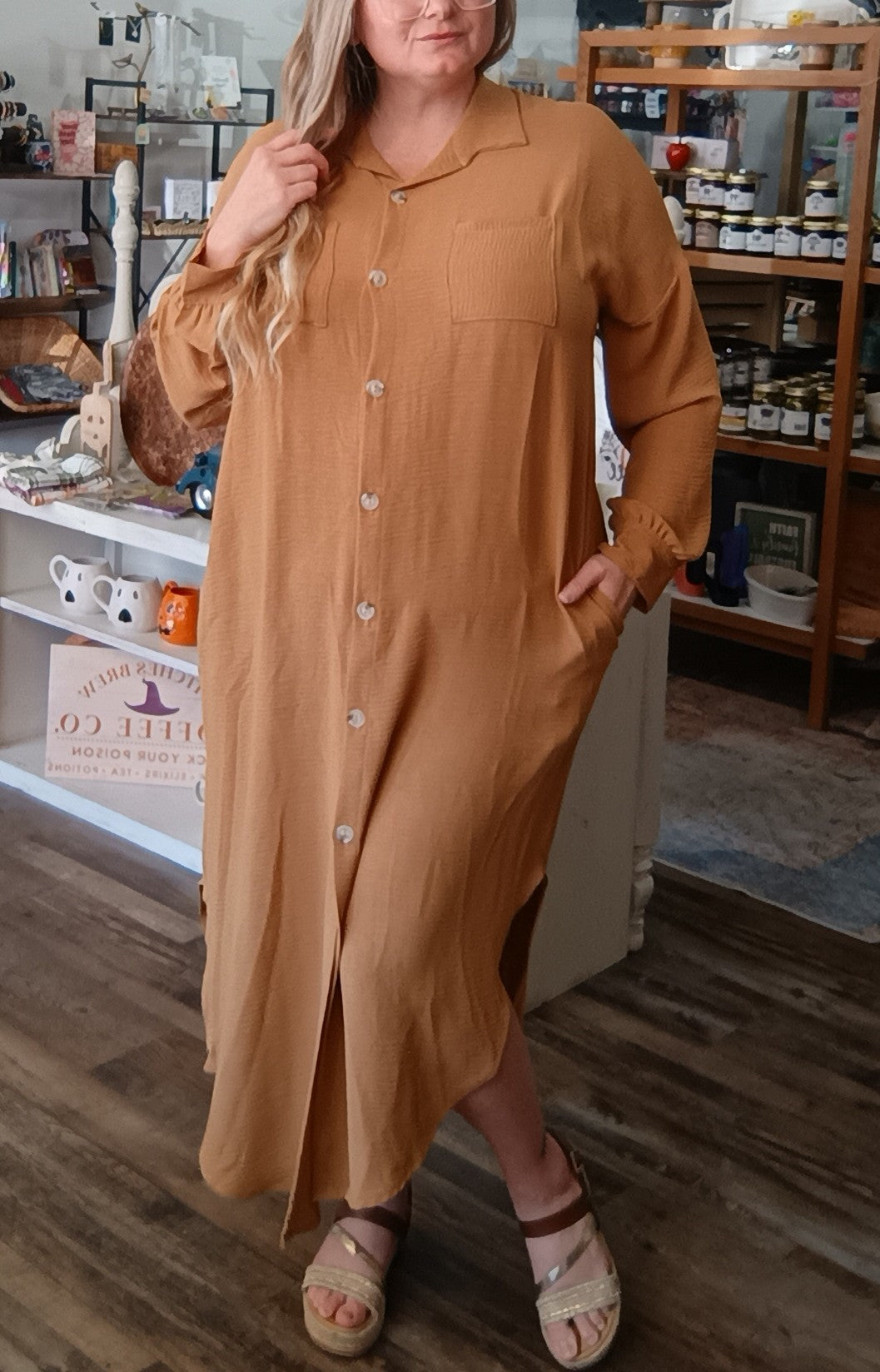 Journey Dress is a maxi length button down dress. Her fabric is breathable, and she has pockets 🎉 Throw a denim jacket on for a layered look, open her up to wear her like a duster, or it's beautiful as a dress. ❤️