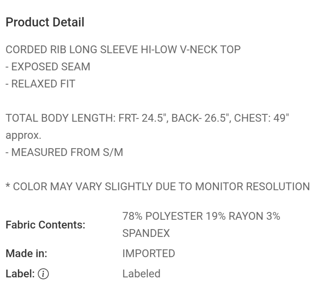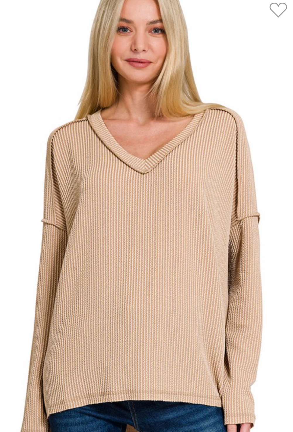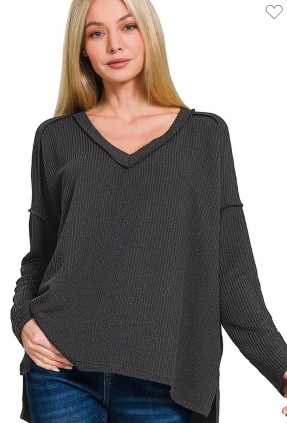 Hi Low V Neck ribbed long sleeve. This is cozy, comfortable, and trendy, and it's available in 3 colors.