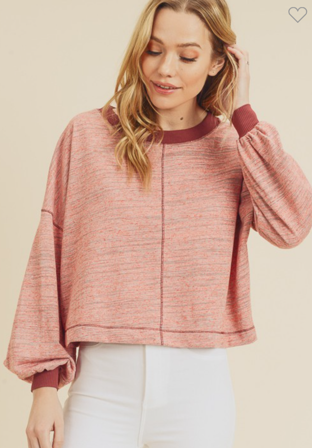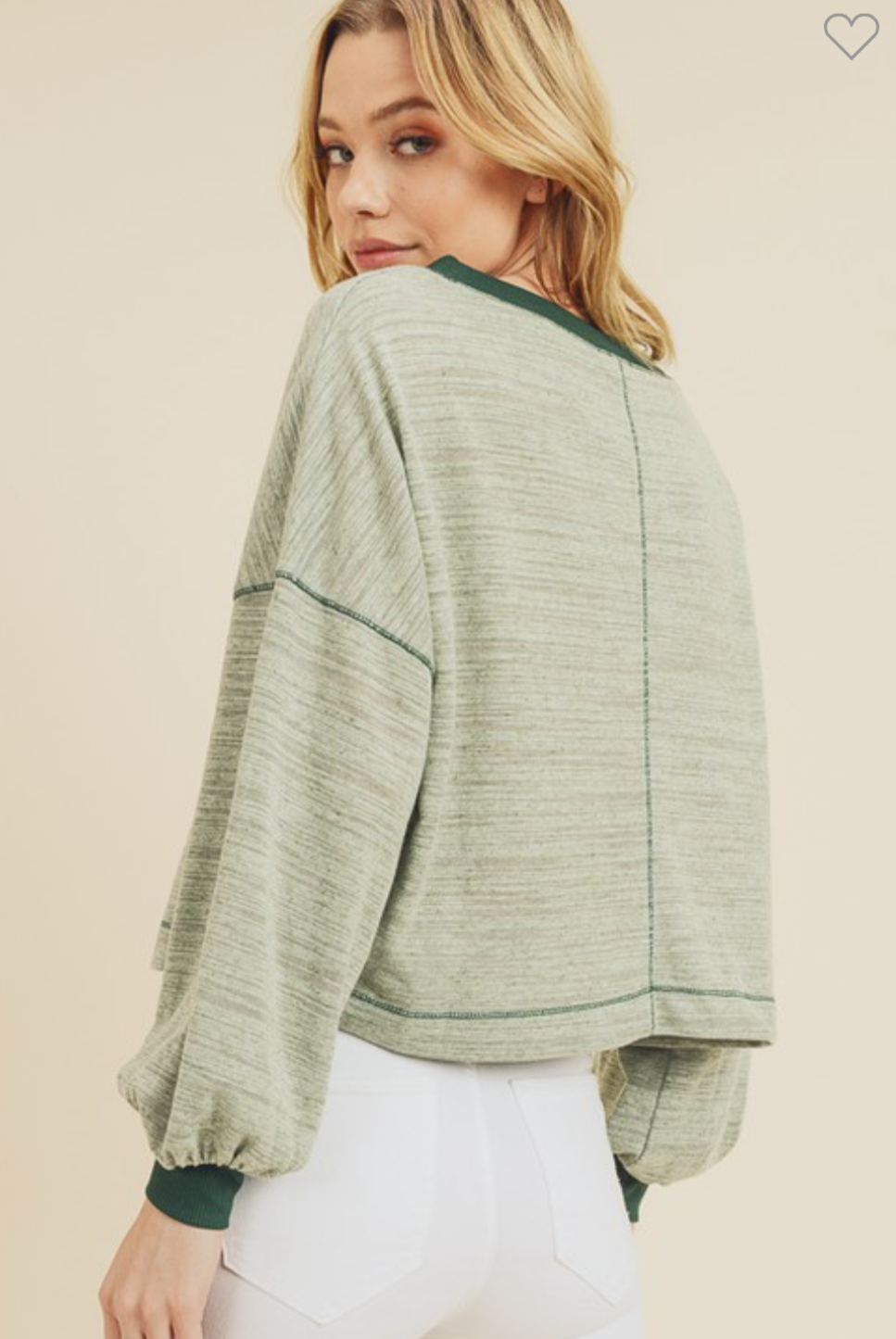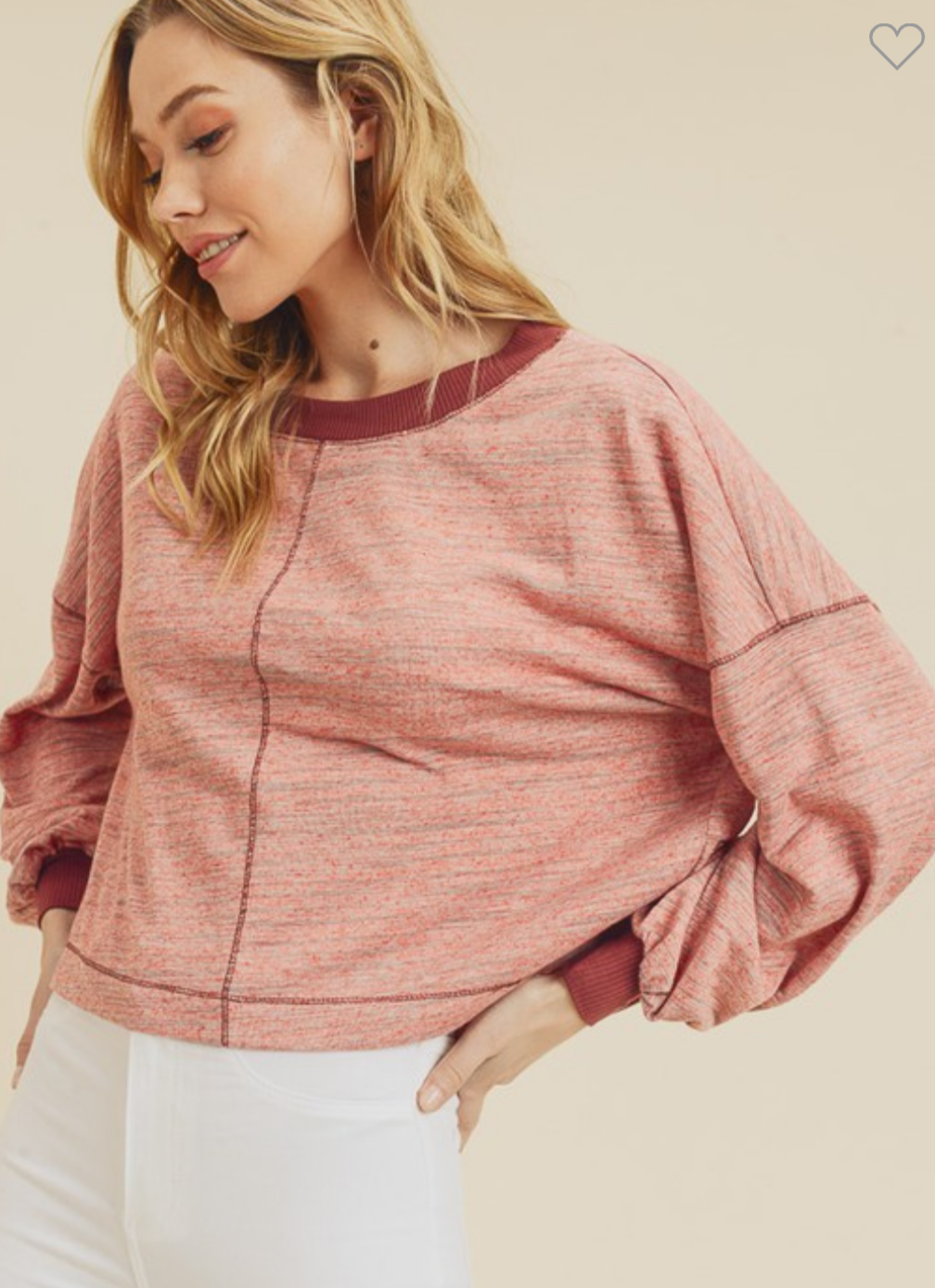 Two Tone Basic long sleeve with contrasting stitch detail. She's slightly cropped with a balloon sleeve. Available in two colors ♥️