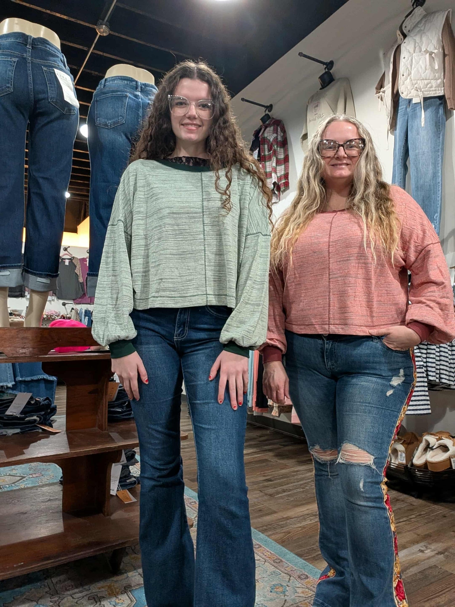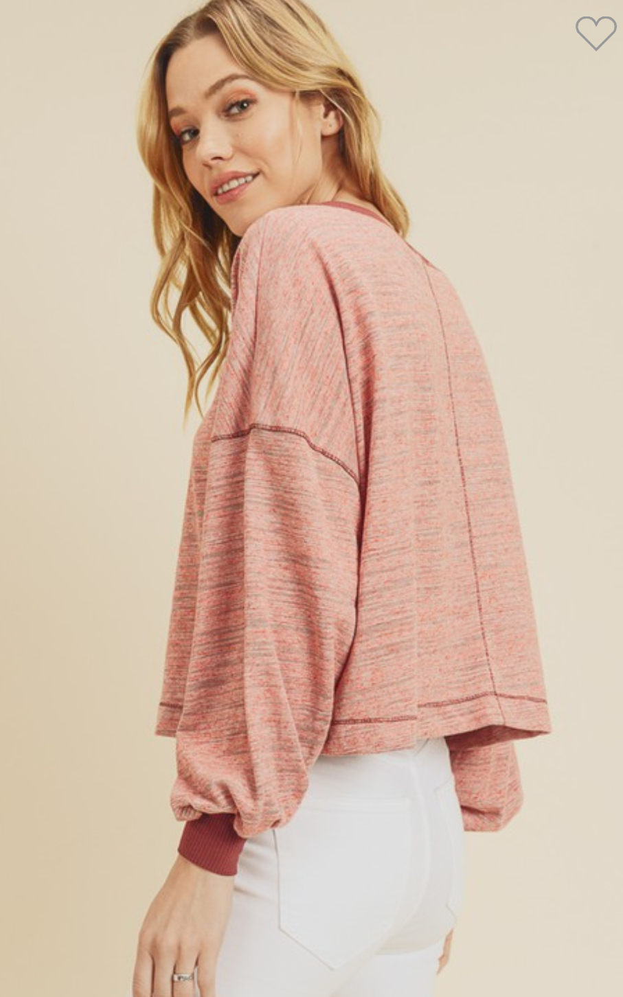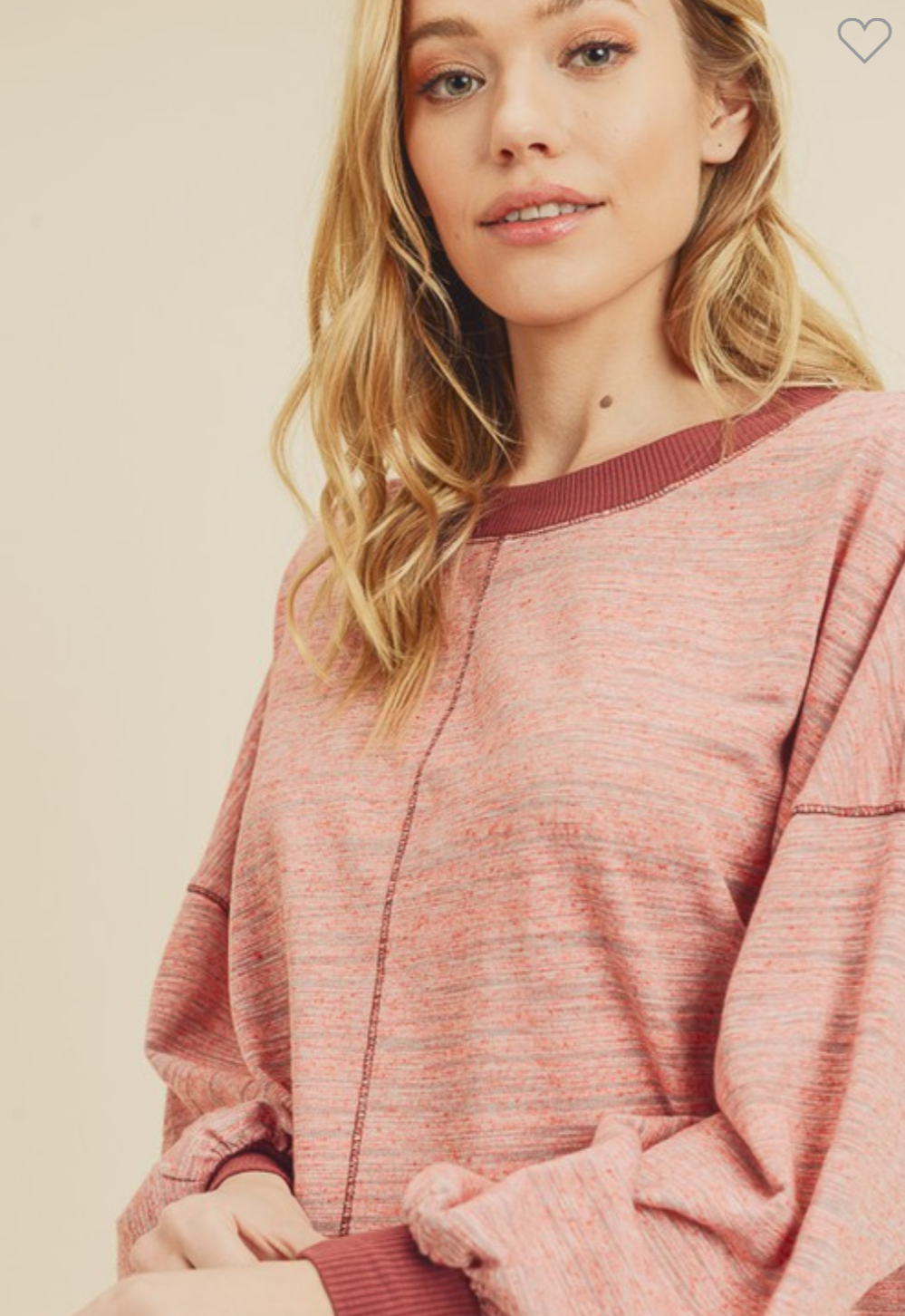 Two Tone Basic long sleeve with contrasting stitch detail. She's slightly cropped with a balloon sleeve. Available in two colors ♥️